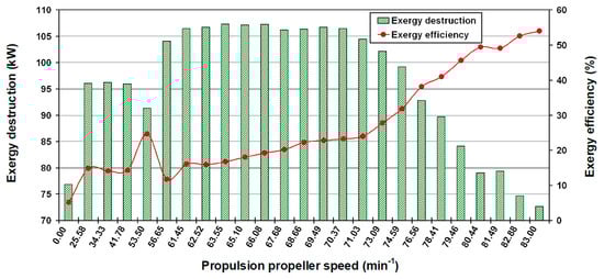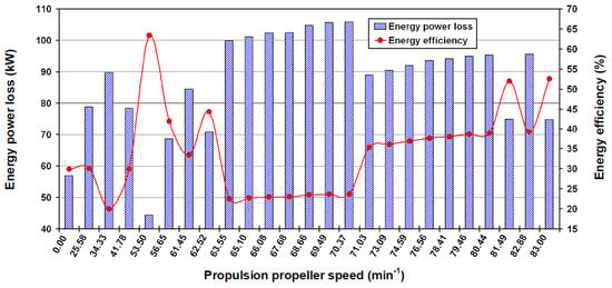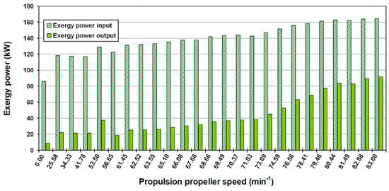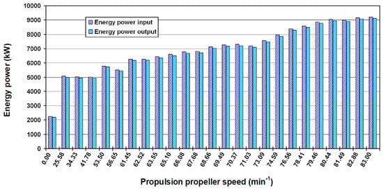 One of the essential elements for the energy and exergy analyses of the forced draft fan is the power produced by the electrical drive and distributed to the forced draft fan. The fan driving power varies according to the system load and is calculated by Equations (20) and (21) along with the measured current from Table 5. The driving power is determined for all of the observed propulsion system loads (propulsion propeller speed) and the results are presented in Figure 4.