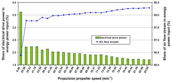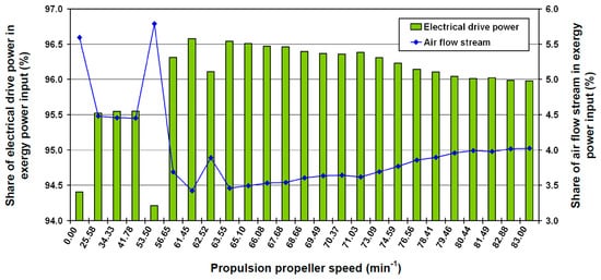 When comparing the calculated results for the forced draft fan driving power (Figure 4), with the measured current from Table 5, it can be noticed that the fan driving power is directly proportional to the induction motor current. During the steam system startup (propulsion propeller speed of 0.00 min−1), the fan driving power is 80.99 kW and increases almost continuously during an increase in the steam system load. At the highest system load (83.00 min−1), the fan driving power is equal to 157.63 kW. The presented change in the fan driving power is expected because an increase in the steam system load simultaneously increases the fuel amount into the steam generator. An increase in the fuel consumption leads to an increase in the air mass flow rate supplied to the steam generator by the forced draft fan in order to maintain complete combustion. The higher air mass flow rates through the forced draft fan necessitate higher power consumptions in the fan drive. This fact is justified with the simultaneous change of the forced draft fan power consumption and the change in the air mass flow rate, as shown in Figure 4 and Table 4.