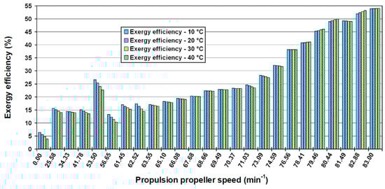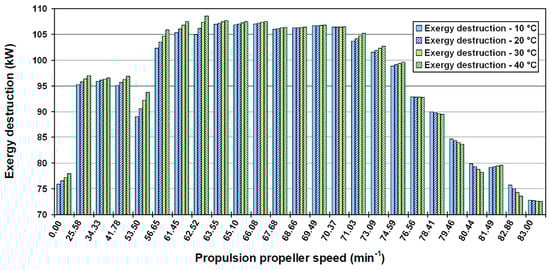 The definition of the ambient state must be explained in detail. First of all, several researchers proposed the above definition of the ambient state [81,82,83]. Moreover, this definition of the ambient state results with a certain temperature difference between the engine room air and ambient air (due to the heat from machinery operation). This temperature difference causes that the specific exergy of the air inside the engine room (at the fan inlet −) is not zero, which means that the engine room air is a part of the fan exergy power input (Equation (16)). The specific exergy of the engine room air () is equal to zero only when the pressure and temperature of that air are equal to the ambient state (according to the specific exergy definition, Equation (9)). In that case, the fan exergy power input (Equation (16)) would include only the electrical drive power.