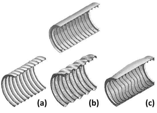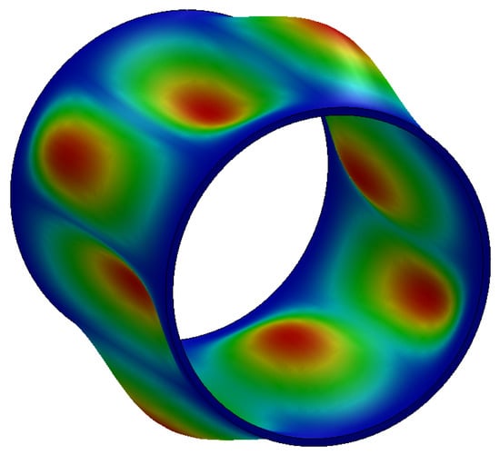Table 4 summarizes the theoretical pressure for the case under examination: the first two columns identify the cylindrical thickness and the number of lobes; the third column reports the values from Equation (1), the fourth column reports the values from Equation (2), the fifth column reports the values from Equation (4), and the last column reports the results of the FEM analysis described below. The values are quite similar among the various formulations.