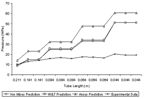 Ross presented a comparison between the theoretical models, the experimental results, and simulated results [21]. For instance, Figure 6 reports the results for an Anticorodal 6082-T6 tube with the outer diameter mm and .