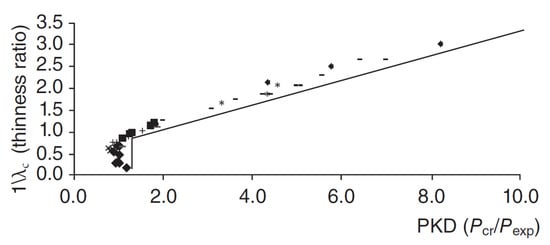 In addition, a safety coefficient (SF) < 3 e.g., arbitrarily 1.5 is added to obtain the real design operative pressure (a value of 3 is used for the case in which people are onboard). It can be seen that if , the structure will probably fail by elastic instability, followed by axisymmetric deformation. Additionally, there is a link between plastic axisymmetric deformation and inelastic shell instability.