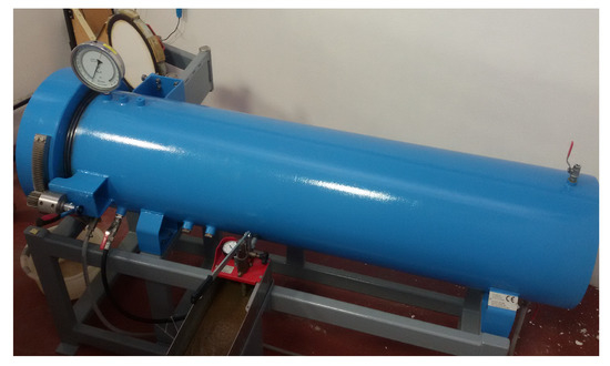 The necessary geometry was obtained by carrying out sizing optimization to perform an FEM comparison and an evaluation of the minimum volume of material—that is, the minimum thickness of the cylinder to withstand the calculated pressure, less than 0.7 MPa. As a result, the axial load was imposed on the frontal section while a uniform external pressure was applied to the structure. The first thickness was set to 10 mm to avoid influencing the test.