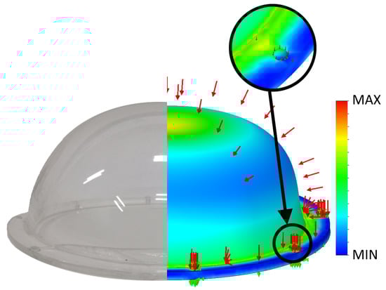 Notably, both the real and the simulated domes are not perfectly hemispherical. With this corrected shape, simulations can be used to predict the real breaking position, as well as the collapse pressure. This characteristic depends directly on the thermoforming process. Moreover, the AR factor and radius of the curvature are very important for numerically reproducing its behavior.