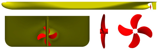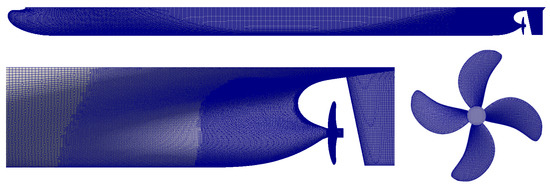 The whole computational domain consists of two sub-domains, the ship sub-domain and the propeller sub-domain. The ship sub-domain is a static region which includes the boundary of the inlet, outlet, hull, and rudder. The propeller sub-domain is a rotating region surrounding the propeller. All the grids of the two sub-domains consists of unstructured hexahedral cells of high quality. For more accurate prediction of the flow detail, several boundary layer cells are inserted near wall surfaces. The overview of the hull, rudder, and propeller surface is shown in Figure 4. The arbitrary mesh interface (AMI) method is applied to interpolate between the non-conforming interfaces of the two sub-domains.