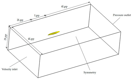The whole computational domain is a box of 7Lpp × 4Lpp × 2Lpp. The boundary conditions on the front, bottom, and sides are velocity inlet, and the boundary condition on the top is symmetry, the boundary condition on the back is pressure outlet, as shown in Figure 3.
