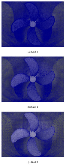 In order to investigate the grid independency, three grid sizes were chosen, as shown in Table 4 and Figure 5. All the ship and propeller regions consist of unstructured hexahedral cells with the same grid topology, generated by HEXPRESS, and the grid refinement ratio is .
