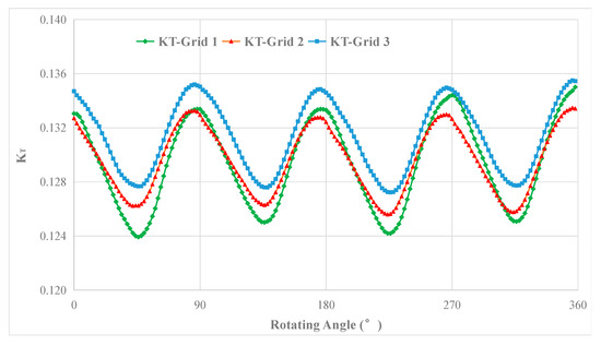 The variation of the thrust coefficient KT over the last full propeller revolution is shown in Figure 6, and the results show that it is obviously periodic.