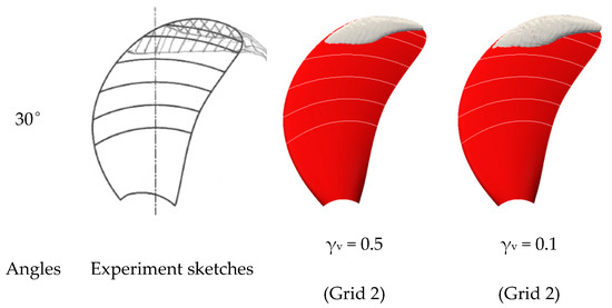 The predicted cavity is represented by vapor iso-surface, and it is true that different value of γv used for the iso-surface can affect the cavitation area, e.g., a larger area with the lower value and a smaller area with the higher value. The two values of γv, 0.5 and 0.1, are used to represent the cavitation pattern in Figure 7. The results show that the dependence is limited, and the cavitation retains the main shape.
