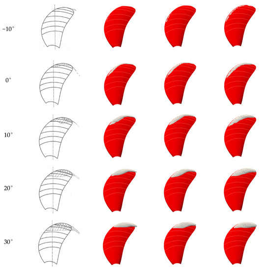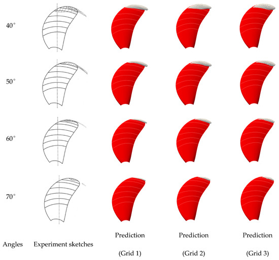 The predicted propeller cavitation using three refined grids behind the stern is compared with benchmark test sketches at the corresponding rotating angles in Figure 8.