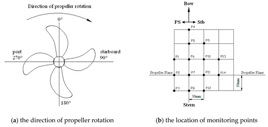The hull pressure fluctuation induced by propeller cavitating flows is an important index that evaluates the propeller cavitation performance, so the monitoring points on the hull surface in the stern region are arranged as shown in Figure 9.