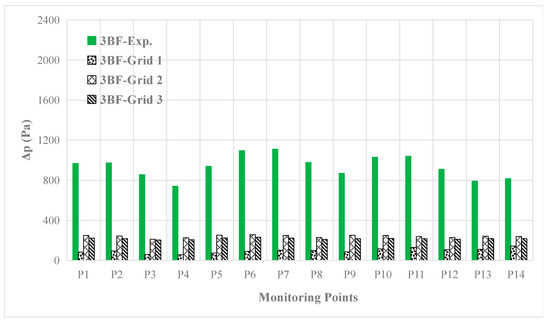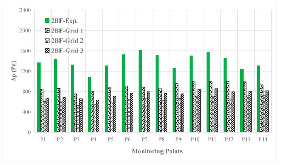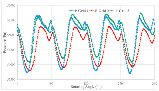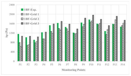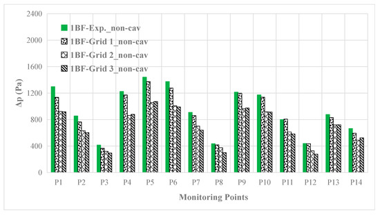 It indicates that the maximum value of the 1BF component of the hull pressure fluctuation is at P5 in the non-cavitating condition, and the values decrease rapidly near the propeller in the vertical plane, such as from P1 to P3, from P5 to P8, and from P9 to P12. The results achieved with Grid 1 are much better than those of the other grids.