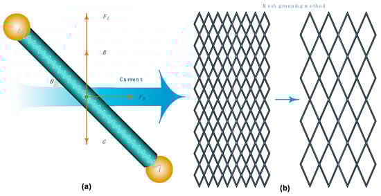Illustrated interpretation. (a) Mechanical compositions of individual net twine in the flow. (b) Mesh grouping method. Netting of the mesh numbered 8 × 8 was grouped into equivalent nets with the grouping ratio r = 2 with constant mesh size.