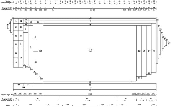 Field measurement was carried out onboard a Chinese tuna purse seiner during an actual fishing operation within the exclusive economic zone (EEZ) of Papua New Guinea. We performed a general linear fit (generalized linear model, GLM) to the dataset using an identity link function to extract the contributing factors associated with the sinking depth, and obtained the standardized regression model (see model protocol in Zhou et al. []). This is reliable for predicting the maximum sinking depth applicable for any cases; therefore, it can be used to compare simulation results under the same conditions. The design drawing and parameter specification of actual fishing gear is shown in Figure 2, Table 1, and Table 2.
