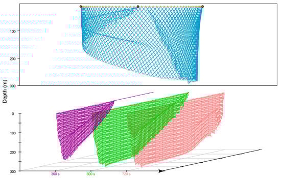 Front view of the seine net in stationary water, showing the instant sinking depth at the end of shooting (top), and the horizontally unfolded plane for three typical points in time after shooting started: 300 s (during shooting, purple), 600 s (end of shooting, green), and 720 s (during pursing, orange) (bottom).