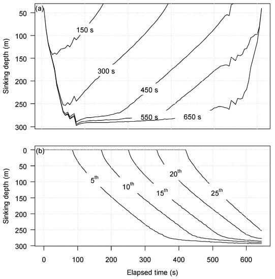 Sinking behavior without flow interference. (a) Vertical configuration and depth of lead line at time phases of 150 s, 300 s, 450 s, 550 s, and 650 s. (b) Changing sinking depth with elapsed time for the 5th, 10th, 15th, 20th, and 25th strips.