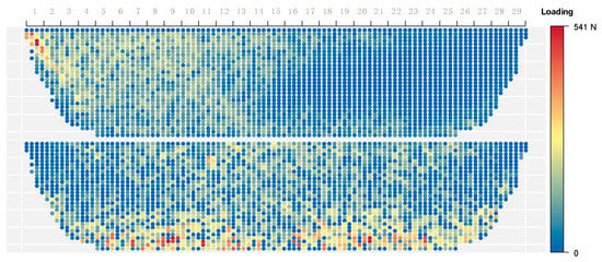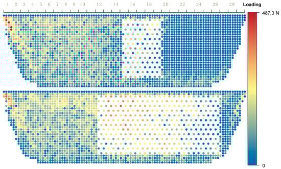 There were 29 strips of netting panels for the overall layout from the bunt to main body in the simulation. Load distribution on each knot showed that at the end of shooting (Figure 6 top), high load areas concentrated in the bunt with a maximum loading of 541 N, followed by the 3rd to 15th strips of the main body, as well as the lower edge along the lead line. From the 16th strip, they were less likely to suffer high loads, except near the bottom. As a result of the hauling force of the purse line during the pursing phase, high load regions spread dominantly at the low edge along the lead line and transmitted upward to the upper main body, with less loads at the two extremities (Figure 6 bottom).