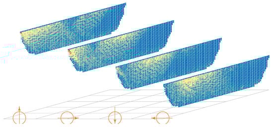 When 0.4 Kn of steady current was applied in the entire water column, we examined net shape and dynamic changes for four shooting patterns on the basis of current direction relative to the orientation of net mouth: 0 (counter-set), 90 (right-cross-set), 180 (forward-set), and 270 degrees (left-cross-set) (Figure 7). In the counter-set, high load was located at the upper area spanning from the bunt to around the 11th strip of the main body, followed by a later section of the main body. The middle section of the net was subjected to less load. The right-cross-set showed higher load in both the bunt and middle upper section. On the contrary, the highest tension for the left-cross-set was between the bunt and middle upper section. Forward-set experienced the lowest load among all the shooting patterns, mostly distributed in the 10th to 16th strips close to the central part of the net. For those two modes of current in the opposite direction (either counter-set to forward-set, or left-cross-set to right-cross-set), the load distributions were always mutually complementary.