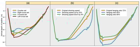 Vertical depth of the entire lead line at the end of shooting. (a) Under four types of settings at 0.4 Kn uniform current: counter-set, right-cross-set, forward-set, and left-cross-set. (b) Under different shooting speeds: normal, 1.25 times the normal, and 0.91 times the normal. (c) Three types of net with different average hanging ratio: 72% (normal), 60%, and 80%.