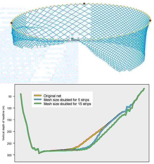 Three-dimensional shape for the net (top panel, five-strip large mesh net only) and the vertical depth of the entire length of the lead line at the end of shooting (bottom panel) for the original net, and the alternative net with its mesh size doubled for 5 strips and 15 strips.