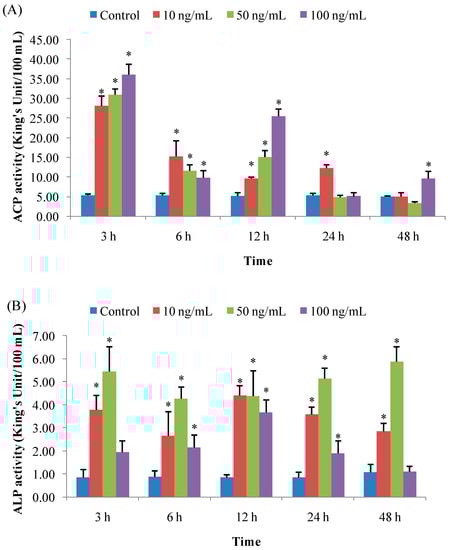 ACP activity (Figure 1A) was significantly enhanced in 10 ng/mL of DA treated group at 3–24 hours post exposure (hpe) comparing with control, and the highest level of ACP activity was observed at 3 hpe. In 50 ng/mL of DA treated group, an obvious enhancement in ACP activity was observed at 3-12 hpe. ACP activity was significantly increased in 100 ng/mL of DA treated group at 3–48 hpe except for 24 hpe.