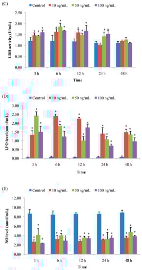 LDH activity (Figure 1C) was significantly increased in the group treated with 10 ng/mL of DA at 3–12 hpe and then reverted to baseline levels at 24–48 hpe. LDH activity was significantly increased in the 50 and 100 ng/mL DA-treated groups at 3–24 hpe and then reverted to baseline levels at 48 hpe.