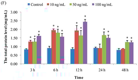 The total protein concentration (Figure 1F) was significantly increased in the 50 and 100 ng/mL DA-treated groups at all time intervals. In the group treated with 10 ng/mL of DA, the total protein concentration was significantly increased at 3–12 hpe and reverted to baseline levels at 24–48 hpe.