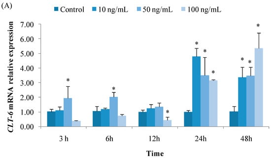 CTL6 mRNA levels (Figure 2A) remained almost unchanged in the group treated with 10 ng/mL of DA at 3–12 hpe; however, CTL6 was significantly upregulated at 24–48 hpe. Accordingly, CTL6 mRNA levels in the 50 ng/mL DA-treated group were significantly higher than those in the control group at 3–48 hpe, except at 12 hpe, which reverted to baseline levels. CTL6 mRNA expression levels remained almost unchanged on treatment with 100 ng/mL of DA at 3–6 hpe; however, they were significantly decreased at 12 hpe and sharply increased (p < 0.05) at 24–48 hpe.