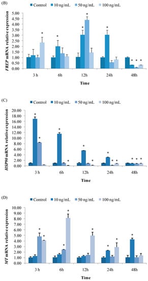 FREP mRNA levels (Figure 2B) in the 10 ng/mL DA-treated group were significantly increased at 6–24 hpe rather than in the control group and sharply decreased (p < 0.05) at 48 hpe. FREP mRNA was strongly induced (p < 0.05) at 12 hpe in the 50 ng/mL of DA group and then decreased markedly at 48 hpe. FREP mRNA expression levels in the 100 ng/mL DA-treated group were significantly increased at 3 hpe and reverted to baseline levels at 6–24 hpe; thereafter, they sharply decreased (p < 0.05) at 48 hpe.