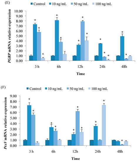 PrxV mRNA levels (Figure 2F) were significantly increase on treatment with 10 ng/mL DA at 3–24 hpe. On treatment with 50 ng/mL DA, PrxV mRNA was significantly upregulated at 3–12 hpe and then significantly downregulated at 48 hpe. PrxV mRNA expression levels did not differ significantly on treatment with 100 ng/mL DA at 3–6 hpe; however, they were significantly increased at 12–24 hpe and reverted to baseline levels at 48 hpe.