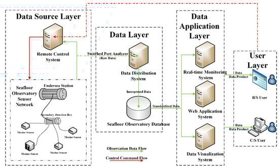 Based on the communication paths of both observation data flow (the green line in Figure 1) and control command flow (the red line in Figure 1) within the sensor web for cabled seafloor observatories, the sensor web architecture (SWA) is structured into four layers: the data source layer, the data layer, the data application layer, and the user layer. Different components within the four layers interact in an information-oriented way, fulfilling the life cycle of the two information flows within the seafloor observatory sensor web.