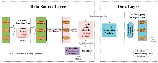 The second plug-and-play mechanism of the proposed SWA starts at the data layer. In terms of the data distribution system, the data interpretation and storage module is the most challenging to design. Seafloor observatory sensors are heterogeneous and dynamically updated, and observation data from each type of sensor demand a specific code for interpretation whose repeatability is low. The Hot Swapping Interpretation Method is thus proposed to enable a flexible and dynamic interpretation of all the raw observation data received by the data distribution system. In this way one particular hot-swapping process does not interfere with the interpretation and storage of other sensors, and the whole process of data interpretation and storage module does not affect the data acquisition module and the data display module []. This is identical to a hot-swappable U disk that has no other effects on the computer or itself.