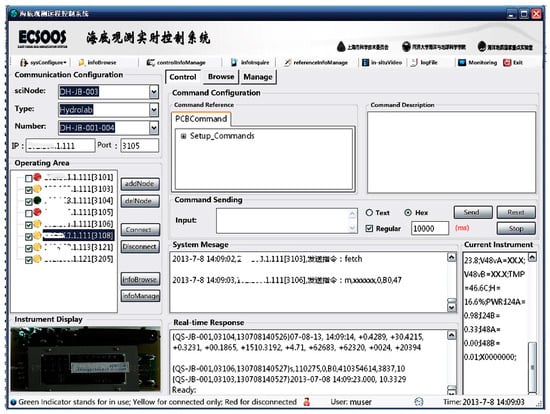 The remote-control system is one of the most important subsystems of ESOSW. The remote-control system guarantees that permitted users could remotely control the deployed seafloor observatory sensor equipment by sending control commands at the control center. With the information-oriented sensor web architecture and the GOE Control Method proposed in Section 2, the remote-control system is implemented as a web-based, module-integrated, plug-and-play marine sensor control system in a C/S mode []. Regarding the server component, an embedded Linux programmed communication control module is introduced in the general junction box (GJB) to provide the transparent conversion between serial communication and network communication for receiving and sending data. Major business functions of the remote-control system are realized by the client component (ESOCS) consisting of five modules, namely, a remote-control module, an information retrieval module, an information management module, a system management module, and a user management module. ESOCS is programmed with.NET Framework Socket, the database of which is established with OSML.