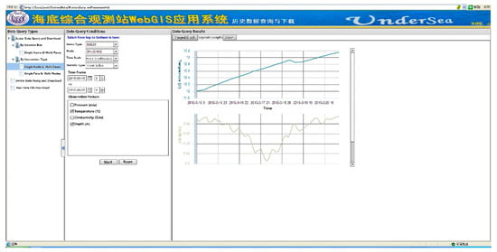 The web application system loads and processes the data on demand by connecting with the seafloor observatory database and shares observatory data resources on the Internet []. The web application system is developed in a B/S mode combined with Rich Internet Applications (RIA), a network application system that possesses system performance similar to traditional desktop systems and demands no extra support software when running on the browser. In the development process, web services are written in C# to operate the seafloor observatory database and are remotely invoked to provide functions such as map browsing, real-time data querying, historical data querying, and data downloading. The map browsing module mainly enables operations such as zooming in/out and moving around. The real-time data querying module provides users with real-time observation data in data tables and line charts from the specified sensor. The historical data querying module provides data in multiple statistical ways, the results of which are also displayed as data tables and line charts. As for the data downloading module, registered and authorized users are able to download data files (.dat) after submitting applications for their interested data. The prototype system is authorized to certain registered users to meet immediate demands of seafloor observatory data applications (seen in Figure 6).