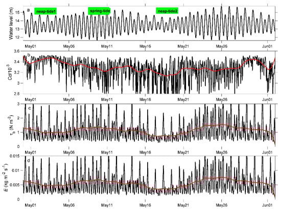 In the case study, drag coefficient, shear stress and sediment transportation rate of the bottom boundary layer in coastal East China Sea were calculated from the ADCP and CTD measurements of the Xiaoqushan Seafloor Observatory. Periodic variations of the three physical parameters during flood/ebbtide and spring/neap tide in May 2009 were respectively recorded in the subgraphs of b, c, and d in Figure 11. The black lines and red lines respectively represent hourly and daily averaged data.