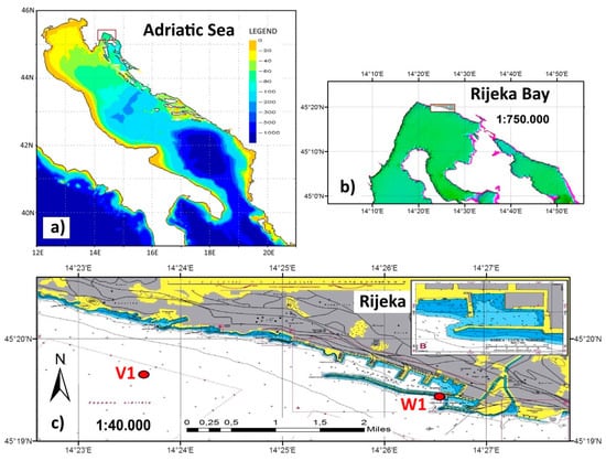 The Adriatic Sea. (a) Bathymetric map of semi-enclosed and archipelagic basin, (b) Rijeka Bay area, (c) location of waverider V1 and anemometer stations.