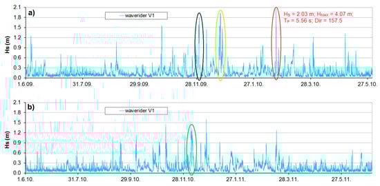 The time series of HS in half-hour resolution for the monitoring period (1.6.2009.–1.7.2011.) are shown in Figure 2. The maximum value was measured on 19.2.2010, 14:00 (HS = 2.03 m; HMAX = 4.07 m; TP = 5.56 s; Dir = 157.5°). Twenty-two situations with HS > 1 m were recognized from the complete set of data. The average value of HMAX/HS for those 22 situations was 1.82. Generally, value HMAX/HS is a function of the number of waves N0 in a wave train or wave record, and more specifically proportional to squared logarithm of N0. According to Goda [], one can expect the value of HMAX/HS in the range of 1.6–2.0.