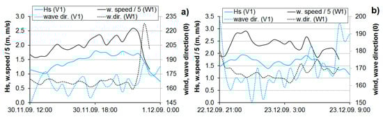 Time series for HS and wave direction at V1, along with wind speed and wind direction at anemographic station W1 for situations 1 and 2. (a) situation 1 (30.11.–1.12.2009), (b) situation 2 (22.–23.12.2009).