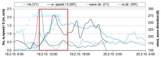 Time series for HS and wave direction at V1, along with wind speed and wind direction at anemographic station W1 for situation 19.2.2010.