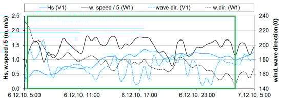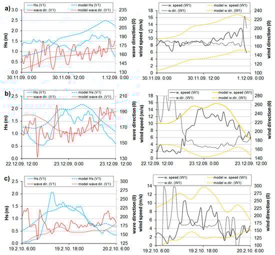 Figure 3, Figure 4 and Figure 5 show HS and wave direction time series, along with wind speed and direction measured at anemographic station W1 near wave station V1 (Figure 1). Representation is given for four situations, 30.11.–1.12.2009, 22–23.12.2009, 19.2.2009, and 6.–7.12.2010.
