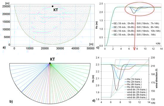 The case of the hypothetical semicircular domain of a 25 km radius was first analyzed (Figure 6). The edges of the model domain represent absorbing boundaries, i.e., there are no open boundaries. The depth is homogeneous and is 50 m. The spatial domain is discretized using a calculation mesh (final volume cells) with distances between the cell centers from 400 m up to 1000 m. In this case, the effective fetches for the KT point and SE, S, SW directions are equal and amount 25 km. Furthermore, if the wind direction changes from SE to the SW direction, the wave height at the KT point will primarily depend on the speed of the wind direction change. Figure 6 shows the cases in which the change of direction SE → SW takes place during 1, 2, 4, and 8 h at a constant wind speed of 18 m/s.