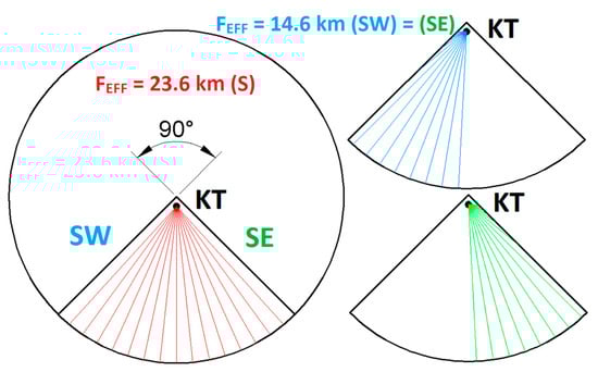 If the spatial domain is defined by one-fourth of the circle (Figure 7), effective fetch is changed during wind transition from SE to SW direction. It should be noted that the position of KT point is moved southerly for 1.4 km (Figure 7). Effective fetch for SE and SW direction for point KT is equal, and amounts 14.6 km. The effective fetch for S direction is the longest and amounts 25 km − 1.4 km = 23.6 km.