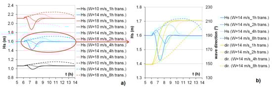 The results shown in Figure 8 express the following phenomenology. Wind direction change SE→SW through one hour (from 6th to 7th hour, full lines) generates the most intense reduction of HS, with a more pronounced reduction at higher wind speeds. The decrease is 9% for wind speed 10 m/s, 13% for wind speed 10 m/s and 5% for wind speed 18 m/s. The extension of the transitional period allows for “recognition” of a larger fetch length during the passage of wind through the S direction. In the case of 4 and 8 h transition period, only the increase of wave height is registered in the transition period. For example, in the transition of 8 h and wind speeds of 10, 14, and 18 m/s, the increase is 8.5, 7.5, and 6.5%, respectively. In the case of a transition of 2 h, a decrease and increase of HS occur (Figure 8). The results of these simulations suggest that the occurrence of the maximum wave height at the position V1 should be expected in situations with slower wind transition from SE or SW.