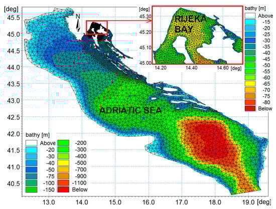 Figure 9 shows the area covered by the spatial domain of the wave generation numerical model (the coverage of the Adriatic basin). In spatial discretization, triangular cells (final volumes) were used. The distance between the numerical nodes, located at the center of each final volume, is variable and extends from 7500 m to the deep-water area of up to 200 m in the zone of the coastline itself. The subject sea area is characterized by a large bathymetric gradient in the coastal zone and the shallow water wave deformations are not essential to the wave generation process. Therefore, the applied calculation step is rational.