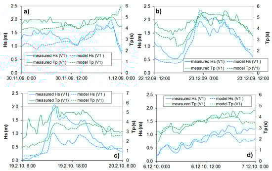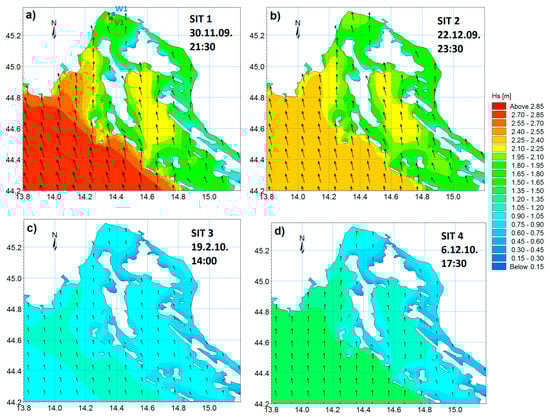 Figure 10 shows the time series of modeled and measured significant wave height HS and TP (peak period) for four analyzed situations with model forcing with wind field according to anemometer data. Figure 11 shows the model fields of HS for the term of maximum recorded HS values at the waverider position V1 in situations 1 to 4. The shown HS fields display only the segment of the model spatial domain in which the Rijeka Bay and the surrounding channel system are located.