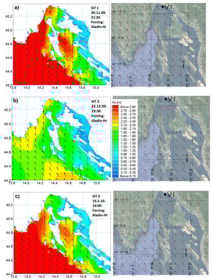 HS fields (left) and Aladin-Hr wind fields (right) for the terms of recorded maxima HS values at the position of V1 station. (a) situation 1, (b) situation 2, (c) situation 3.