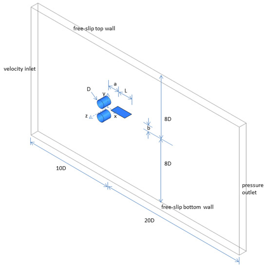 Previous studies on flow around bluff bodies with adjacent plates may also provide useful context for the present work. The flow past a single cylinder with plates has received much attention in the past decades, especially for passive flow/vortex control (and, subsequently, flow-induced vibration control) of a cylinder (see, for example, [10,11,12,13]), understanding of plate dynamics (for instance, [14,15]), and potential for energy harvesting (see, for example, [16,17]). Less well explored is the flow with plates behind two or multiple cylinders. Furquan et al. [18] computationally investigated vibration response of two flexible splitter plates, each placed behind two side-by-side square cylinders (that are separated by center-to-center distance equal to twice the square edge length L) at under varying reduced velocities (, where is plate natural frequency). Their results indicate initial anti-phase plate vibration as the plates are attracted towards each other with the accelerating gap flow, before finally synchronizing into an in-phase plate vibration pattern that also exhibits the “lock-in” phenomenon at certain range of , as either plate undergoes large vibration amplitudes when its response frequency approaches the plate’s first mode natural frequency. The effect of short splitter plates behind two side-by-side square cylinders (with center-to-center distance equal 3.6 times the square edge length) on their vortex shedding and subsequent sound generation were examined experimentally for of 10,000–33,000 by Octavianty and Asai [19]. In this symmetric flow regime and high , generated vortices past the side-by-side square cylinders were highly synchronized and coherent spanwise, allowing effective sound reduction even with shorter splitter plates—in contrast to a single square cylinder where vortices were more three-dimensional and the effect of splitter plate was limited. Oruc et al. [20] experimented with splitter plates centrally placed between two side-by-side circular cylinders and examined their effect on the flip-flopping gap flow in the biased flow regime. It was found that, at sufficient plate lengths, the asymmetric and bistable wake flow were suppressed, resulting in two symmetric and stable wake patterns.