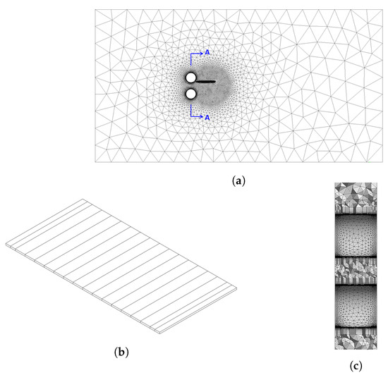 Figure 2 illustrates the unstructured grids employed to discretize the fluid computational domain. A three-dimensional meshing scheme is used where finer meshing is prescribed in the vicinity of the two cylinders and flexible plate. In addition, denser grid points representing the boundary layer meshing is employed close to the surfaces of the cylinders and flexible plate, in order to better resolve their boundary layers. The first grid point normal to both cylinders and flexible plate in the boundary layer mesh were defined away from their surfaces, maintaining maximum in all simulation cases. As a result, depending on the simulation case, the baseline grid for the fluid domain consisted of 86,847–95,075 nodes (with 253,243–291,778 elements), while the plate was meshed using structured grids having 76 nodes (with 18 solid elements).