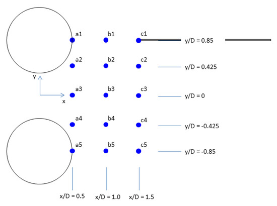 As vortex strength weakens further downstream of a cylinder, we considered a window in the wake region between and to place a flexible plate in the present study. In total, 15 cases were simulated corresponding to locations where leading edge of cantilever plate was fixed, as depicted in Figure 3. These cases are also tabulated in Table 6, highlighting their corresponding streamwise (x) and crossflow (y) coordinate positions.