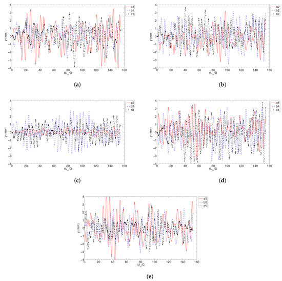 Plate tip y-displacements for plate positioned at x/D = 0.5, 1.0, 1.5 (denoted by case numbers in each chart legend) at several y/D locations: (a) y/D = 0.85; (b) y/D = 0.425; (c) y/D = 0; (d) y/D = −0.425; and (e) y/D = −0.85. Note that the solid red lines represent cases at x/D = 0.5, dashed-dotted blue lines represent cases at x/D = 1.0 and black dashed lines with circle markers represent cases at x/D = 1.5.